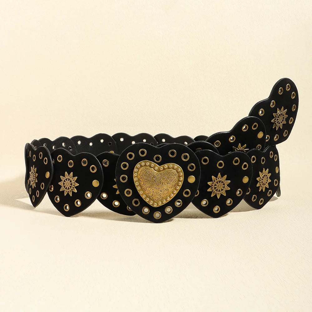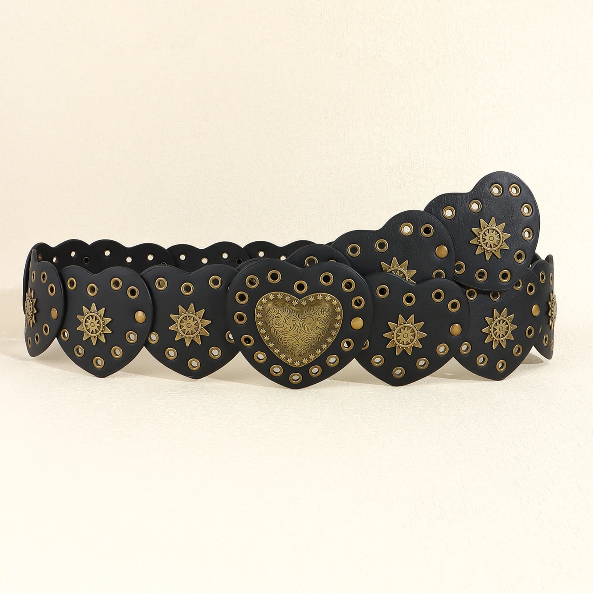 O design coração e os detalhes metálicos envelhecidos dão um toque romântico e ousado ao visual vintage — perfeito para quem ama moda com atitude.